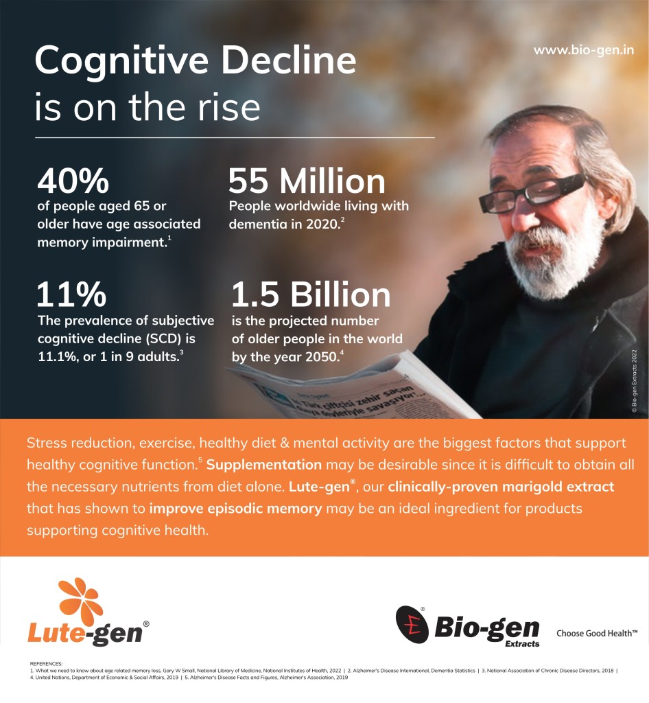 Cognitive decline affects a large portion of our older population and limits their ability to live & work efficiently, and have a good quality of life. An effective, all-natural ingredient like Lute-gen® may be ideal to design products catered to support their healthy cognitive function.